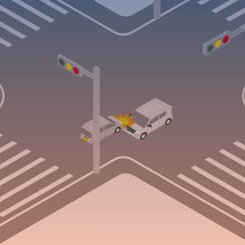 ・イラストに使用している各要素(車、背景、車、天候、信号、衝突地点など)は、代表的なイメージをイラスト化しており、色や形状等含め現実の事故の状況とは異なります。あくまで、事故のイメージとして参考までにご活用ください。