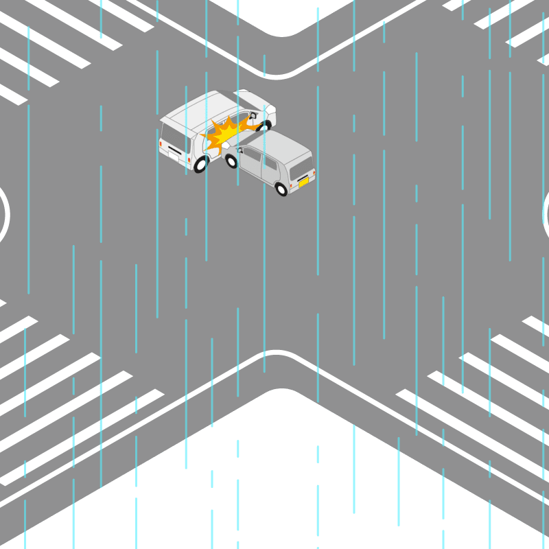 ・イラストに使用している各要素(車、背景、車、天候、信号、衝突地点など)は、代表的なイメージをイラスト化しており、色や形状等含め現実の事故の状況とは異なります。あくまで、事故のイメージとして参考までにご活用ください。