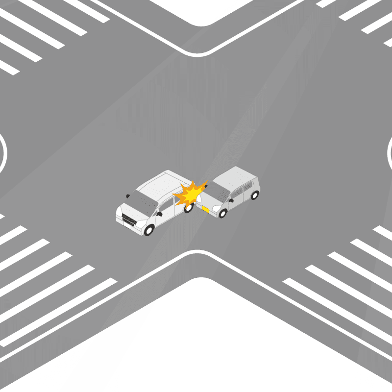 ・イラストに使用している各要素(車、背景、車、天候、信号、衝突地点など)は、代表的なイメージをイラスト化しており、色や形状等含め現実の事故の状況とは異なります。あくまで、事故のイメージとして参考までにご活用ください。