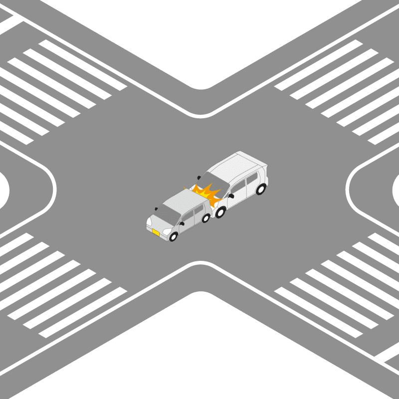 ・イラストに使用している各要素(車、背景、車、天候、信号、衝突地点など)は、代表的なイメージをイラスト化しており、色や形状等含め現実の事故の状況とは異なります。あくまで、事故のイメージとして参考までにご活用ください。