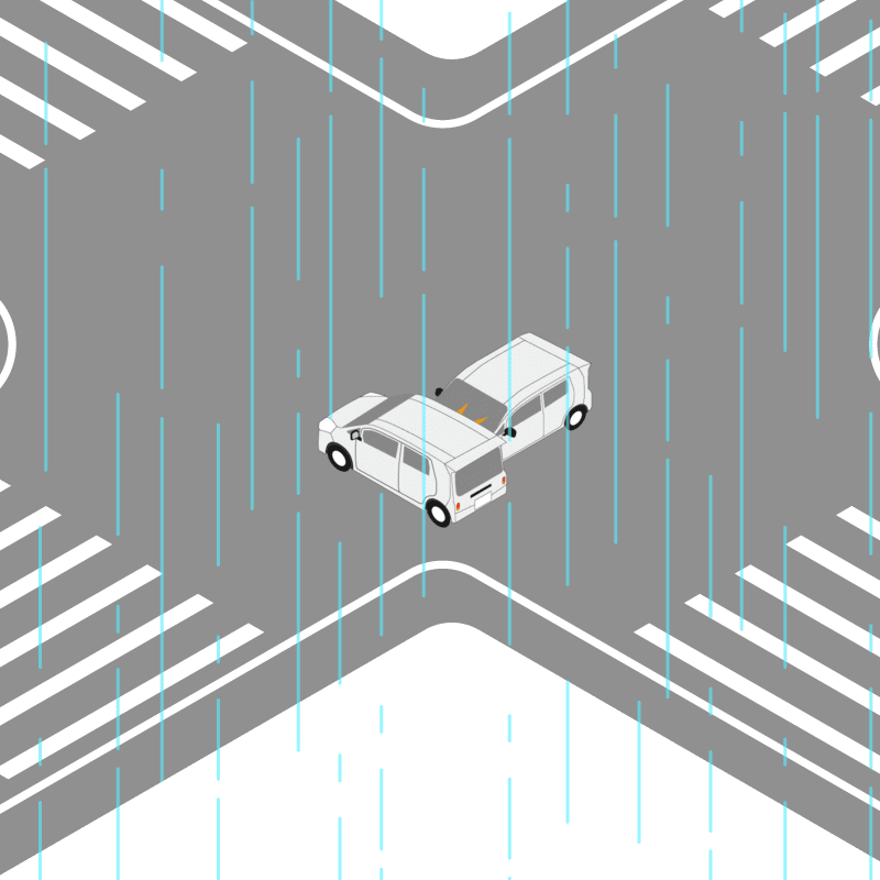 ・イラストに使用している各要素(車、背景、車、天候、信号、衝突地点など)は、代表的なイメージをイラスト化しており、色や形状等含め現実の事故の状況とは異なります。あくまで、事故のイメージとして参考までにご活用ください。