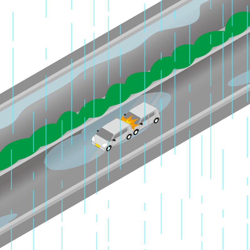 ・イラストに使用している各要素(車、背景、車、天候、信号、衝突地点など)は、代表的なイメージをイラスト化しており、色や形状等含め現実の事故の状況とは異なります。あくまで、事故のイメージとして参考までにご活用ください。