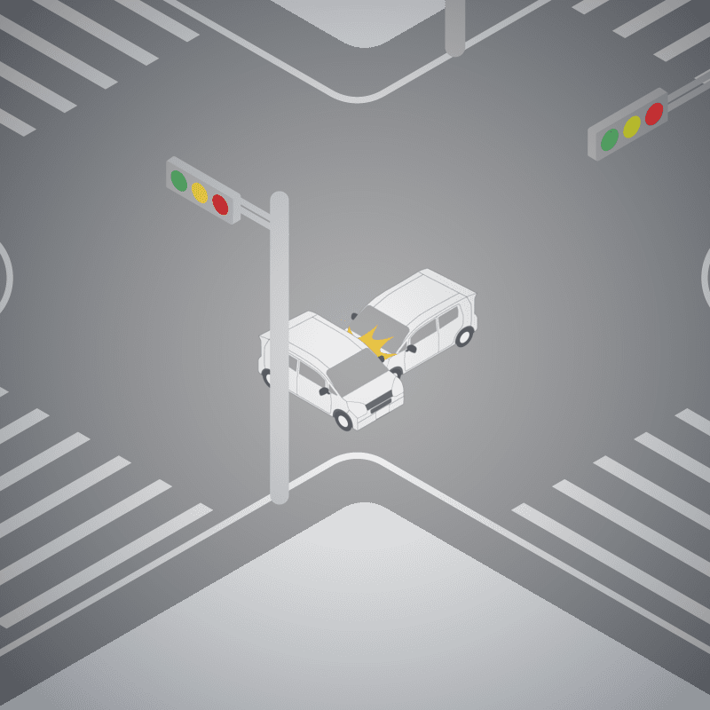 ・イラストに使用している各要素(車、背景、車、天候、信号、衝突地点など)は、代表的なイメージをイラスト化しており、色や形状等含め現実の事故の状況とは異なります。あくまで、事故のイメージとして参考までにご活用ください。