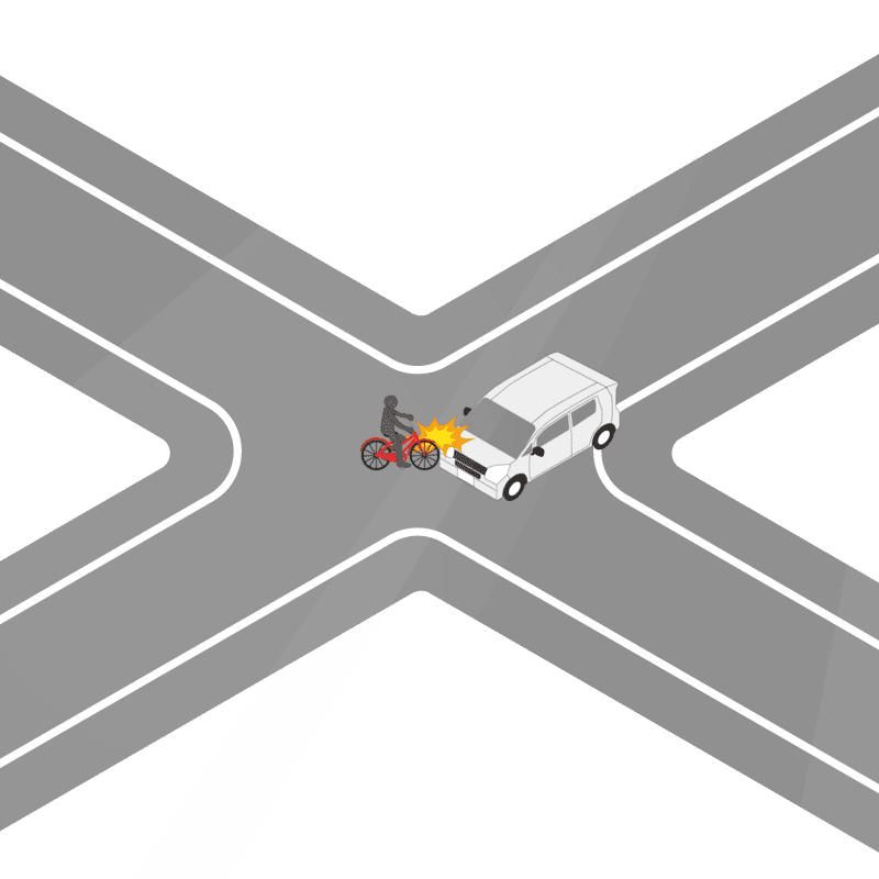 ・イラストに使用している各要素(車、背景、車、天候、信号、衝突地点など)は、代表的なイメージをイラスト化しており、色や形状等含め現実の事故の状況とは異なります。あくまで、事故のイメージとして参考までにご活用ください。