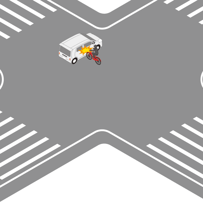・イラストに使用している各要素(車、背景、車、天候、信号、衝突地点など)は、代表的なイメージをイラスト化しており、色や形状等含め現実の事故の状況とは異なります。あくまで、事故のイメージとして参考までにご活用ください。