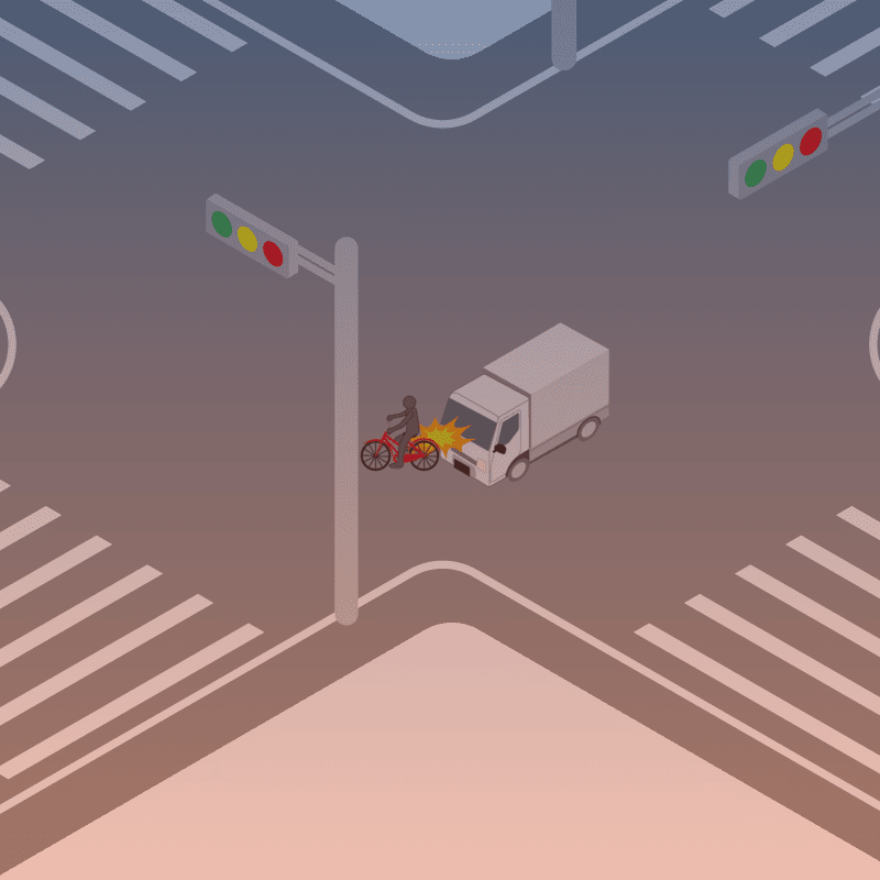 ・イラストに使用している各要素(車、背景、車、天候、信号、衝突地点など)は、代表的なイメージをイラスト化しており、色や形状等含め現実の事故の状況とは異なります。あくまで、事故のイメージとして参考までにご活用ください。