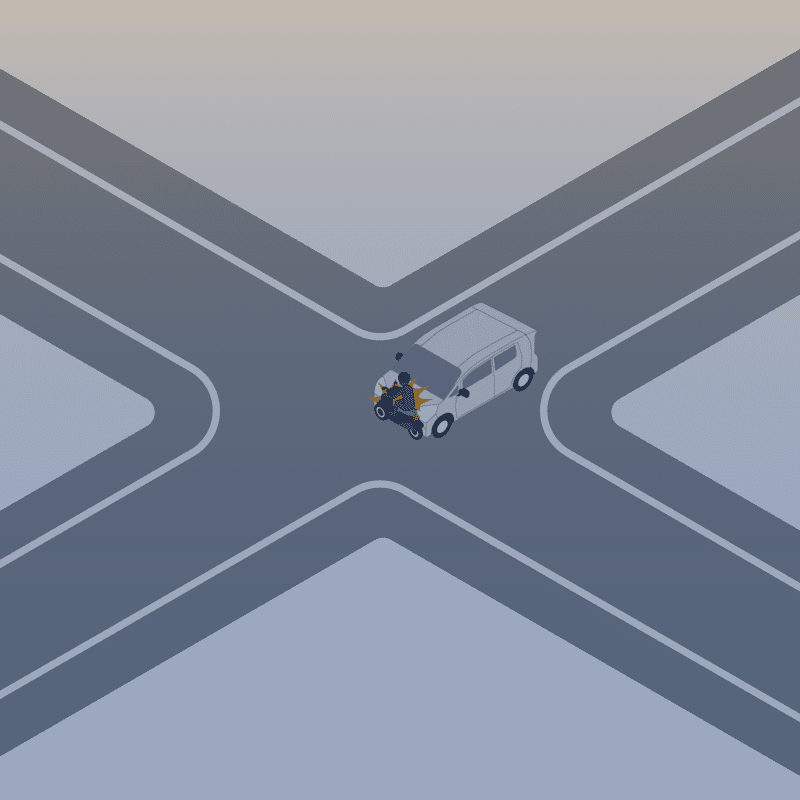 ・イラストに使用している各要素(車、背景、車、天候、信号、衝突地点など)は、代表的なイメージをイラスト化しており、色や形状等含め現実の事故の状況とは異なります。あくまで、事故のイメージとして参考までにご活用ください。