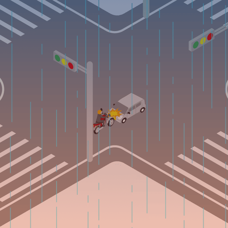 ・イラストに使用している各要素(車、背景、車、天候、信号、衝突地点など)は、代表的なイメージをイラスト化しており、色や形状等含め現実の事故の状況とは異なります。あくまで、事故のイメージとして参考までにご活用ください。