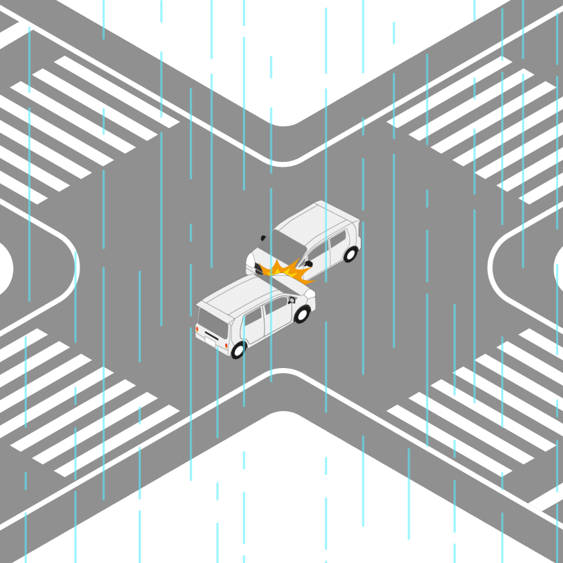 ・イラストに使用している各要素(車、背景、車、天候、信号、衝突地点など)は、代表的なイメージをイラスト化しており、色や形状等含め現実の事故の状況とは異なります。あくまで、事故のイメージとして参考までにご活用ください。