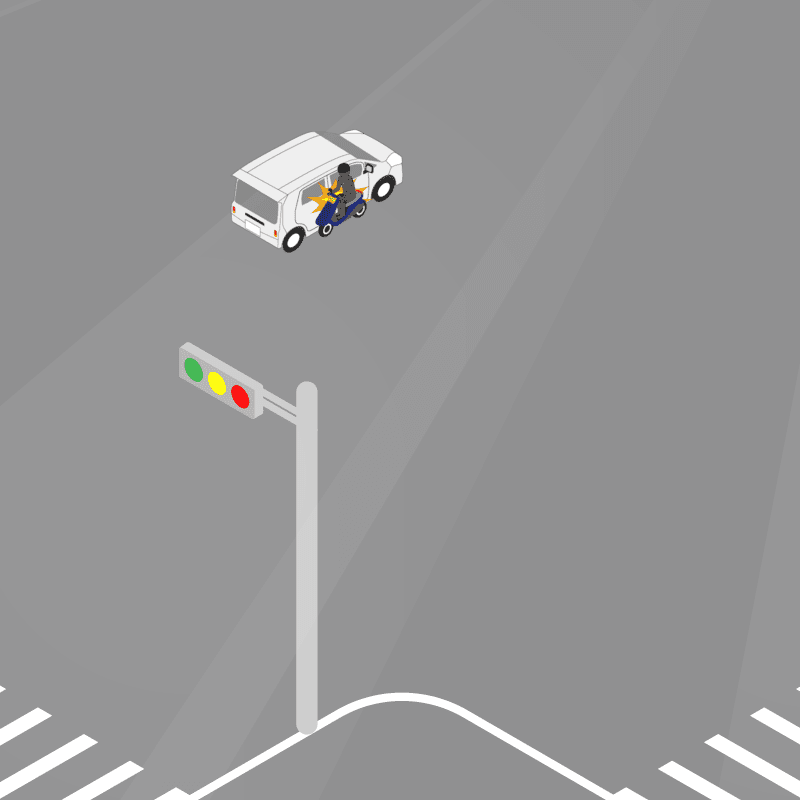・イラストに使用している各要素(車、背景、車、天候、信号、衝突地点など)は、代表的なイメージをイラスト化しており、色や形状等含め現実の事故の状況とは異なります。あくまで、事故のイメージとして参考までにご活用ください。