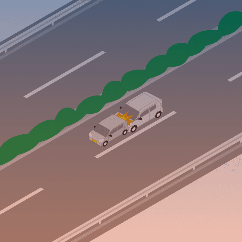 ・イラストに使用している各要素(車、背景、車、天候、信号、衝突地点など)は、代表的なイメージをイラスト化しており、色や形状等含め現実の事故の状況とは異なります。あくまで、事故のイメージとして参考までにご活用ください。