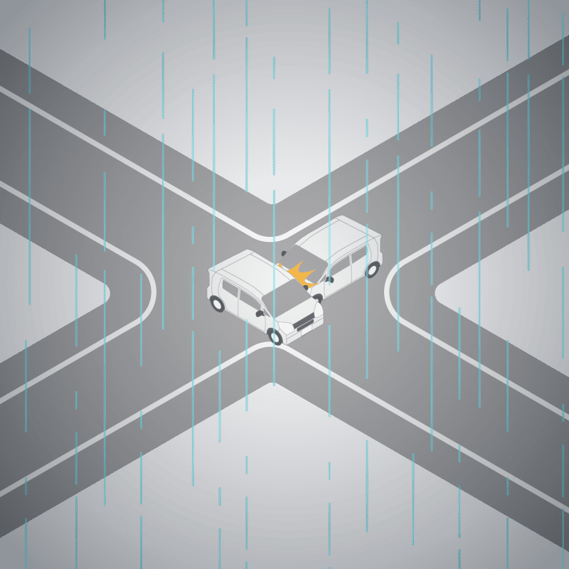 ・イラストに使用している各要素(車、背景、車、天候、信号、衝突地点など)は、代表的なイメージをイラスト化しており、色や形状等含め現実の事故の状況とは異なります。あくまで、事故のイメージとして参考までにご活用ください。