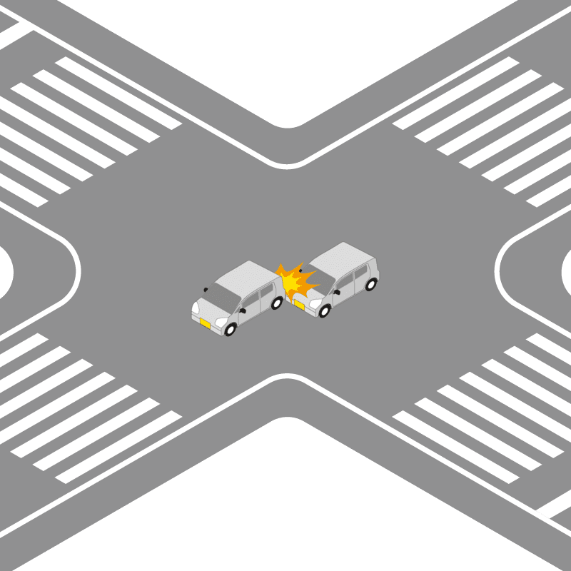 ・イラストに使用している各要素(車、背景、車、天候、信号、衝突地点など)は、代表的なイメージをイラスト化しており、色や形状等含め現実の事故の状況とは異なります。あくまで、事故のイメージとして参考までにご活用ください。