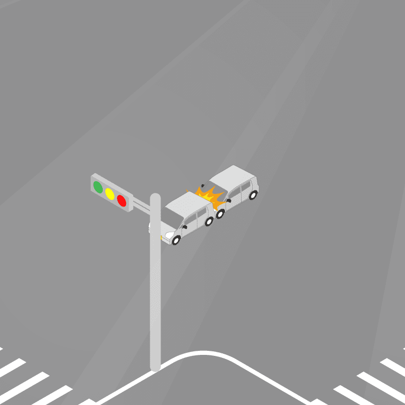 ・イラストに使用している各要素(車、背景、車、天候、信号、衝突地点など)は、代表的なイメージをイラスト化しており、色や形状等含め現実の事故の状況とは異なります。あくまで、事故のイメージとして参考までにご活用ください。