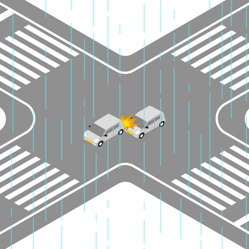 ・イラストに使用している各要素(車、背景、車、天候、信号、衝突地点など)は、代表的なイメージをイラスト化しており、色や形状等含め現実の事故の状況とは異なります。あくまで、事故のイメージとして参考までにご活用ください。