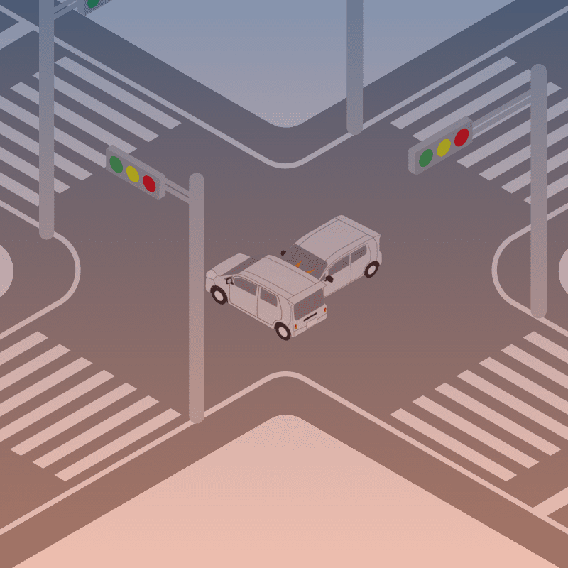 ・イラストに使用している各要素(車、背景、車、天候、信号、衝突地点など)は、代表的なイメージをイラスト化しており、色や形状等含め現実の事故の状況とは異なります。あくまで、事故のイメージとして参考までにご活用ください。