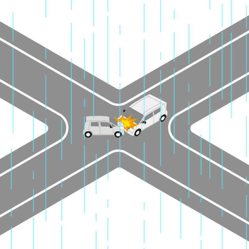 ・イラストに使用している各要素(車、背景、車、天候、信号、衝突地点など)は、代表的なイメージをイラスト化しており、色や形状等含め現実の事故の状況とは異なります。あくまで、事故のイメージとして参考までにご活用ください。