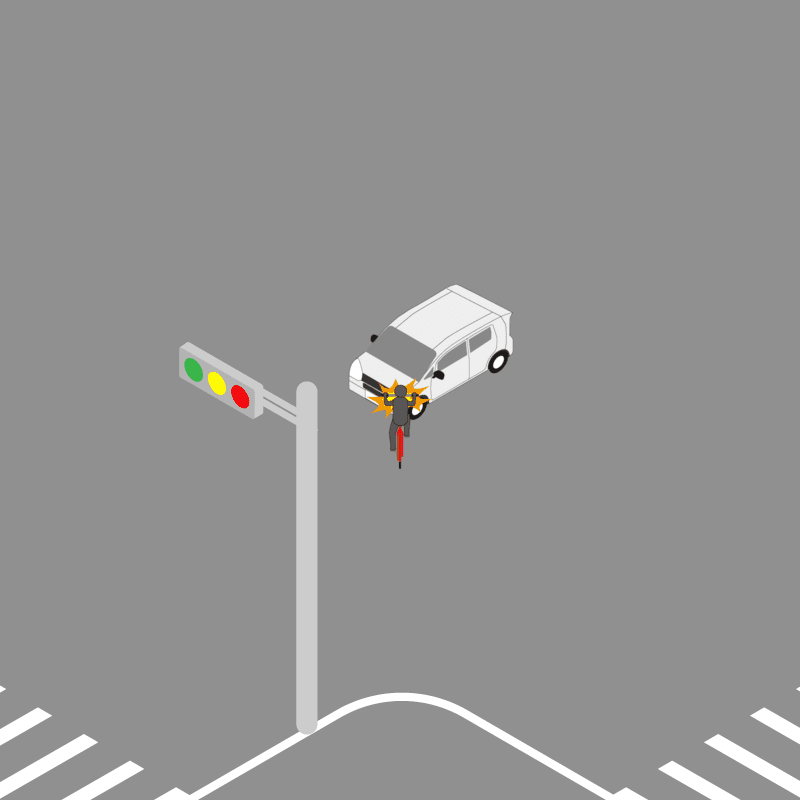 ・イラストに使用している各要素(車、背景、車、天候、信号、衝突地点など)は、代表的なイメージをイラスト化しており、色や形状等含め現実の事故の状況とは異なります。あくまで、事故のイメージとして参考までにご活用ください。