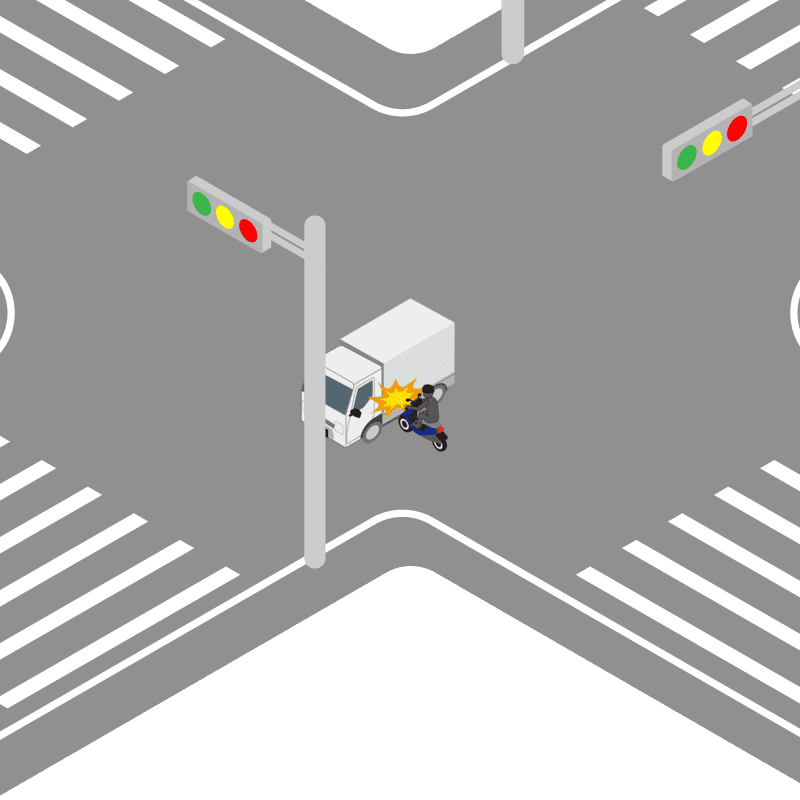 ・イラストに使用している各要素(車、背景、車、天候、信号、衝突地点など)は、代表的なイメージをイラスト化しており、色や形状等含め現実の事故の状況とは異なります。あくまで、事故のイメージとして参考までにご活用ください。