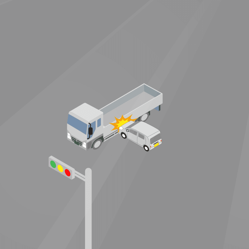 ・イラストに使用している各要素(車、背景、車、天候、信号、衝突地点など)は、代表的なイメージをイラスト化しており、色や形状等含め現実の事故の状況とは異なります。あくまで、事故のイメージとして参考までにご活用ください。