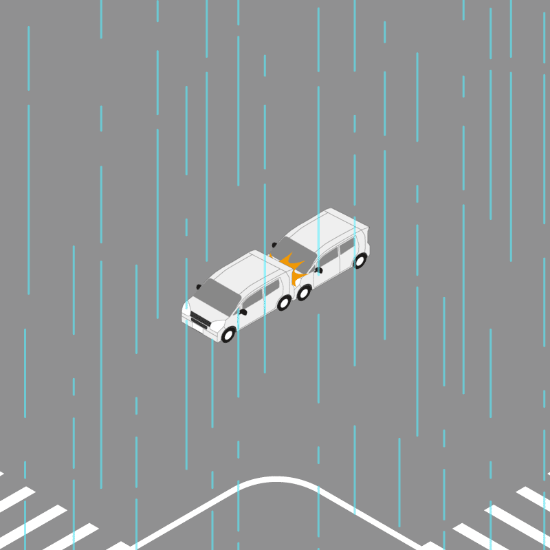 ・イラストに使用している各要素(車、背景、車、天候、信号、衝突地点など)は、代表的なイメージをイラスト化しており、色や形状等含め現実の事故の状況とは異なります。あくまで、事故のイメージとして参考までにご活用ください。