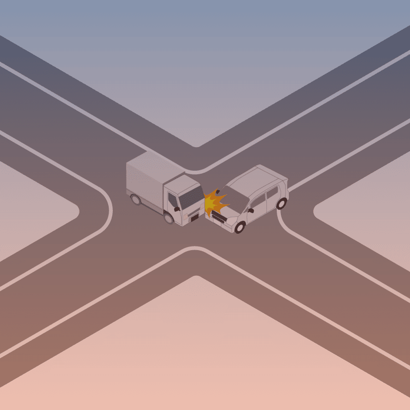 ・イラストに使用している各要素(車、背景、車、天候、信号、衝突地点など)は、代表的なイメージをイラスト化しており、色や形状等含め現実の事故の状況とは異なります。あくまで、事故のイメージとして参考までにご活用ください。