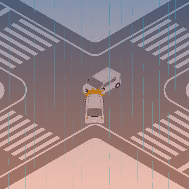 ・イラストに使用している各要素(車、背景、車、天候、信号、衝突地点など)は、代表的なイメージをイラスト化しており、色や形状等含め現実の事故の状況とは異なります。あくまで、事故のイメージとして参考までにご活用ください。