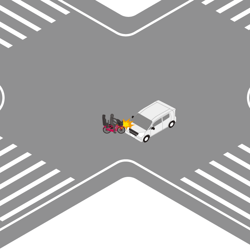 ・イラストに使用している各要素(車、背景、車、天候、信号、衝突地点など)は、代表的なイメージをイラスト化しており、色や形状等含め現実の事故の状況とは異なります。あくまで、事故のイメージとして参考までにご活用ください。