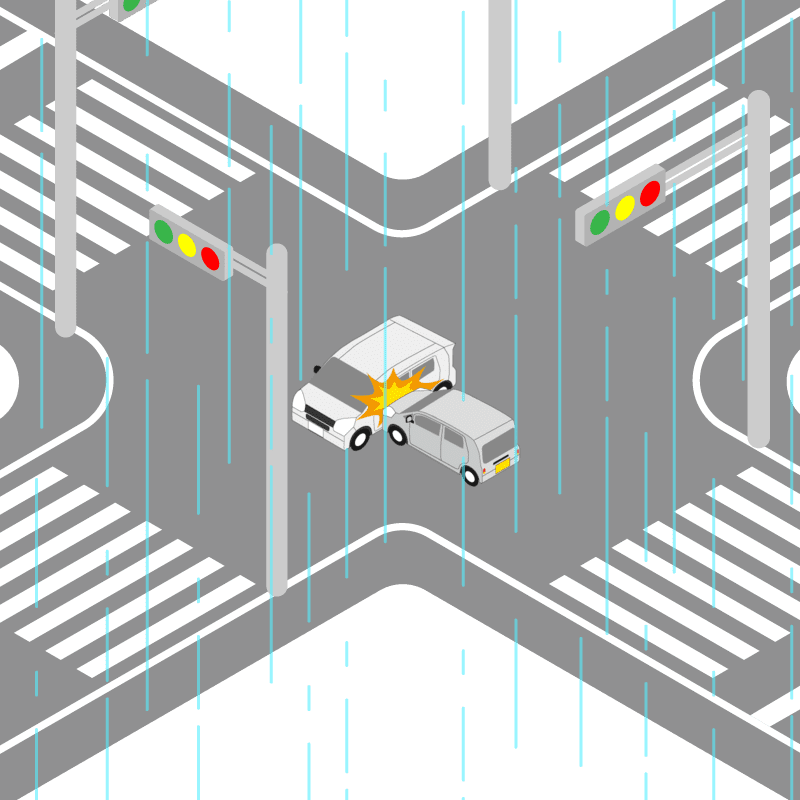 ・イラストに使用している各要素(車、背景、車、天候、信号、衝突地点など)は、代表的なイメージをイラスト化しており、色や形状等含め現実の事故の状況とは異なります。あくまで、事故のイメージとして参考までにご活用ください。