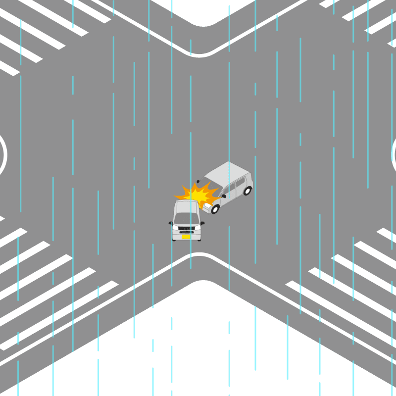 ・イラストに使用している各要素(車、背景、車、天候、信号、衝突地点など)は、代表的なイメージをイラスト化しており、色や形状等含め現実の事故の状況とは異なります。あくまで、事故のイメージとして参考までにご活用ください。