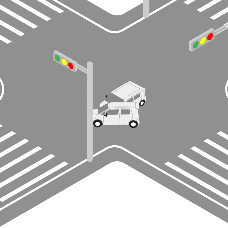 ・イラストに使用している各要素(車、背景、車、天候、信号、衝突地点など)は、代表的なイメージをイラスト化しており、色や形状等含め現実の事故の状況とは異なります。あくまで、事故のイメージとして参考までにご活用ください。