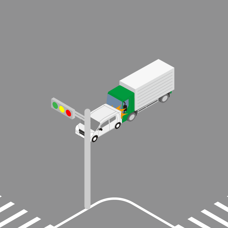 ・イラストに使用している各要素(車、背景、車、天候、信号、衝突地点など)は、代表的なイメージをイラスト化しており、色や形状等含め現実の事故の状況とは異なります。あくまで、事故のイメージとして参考までにご活用ください。