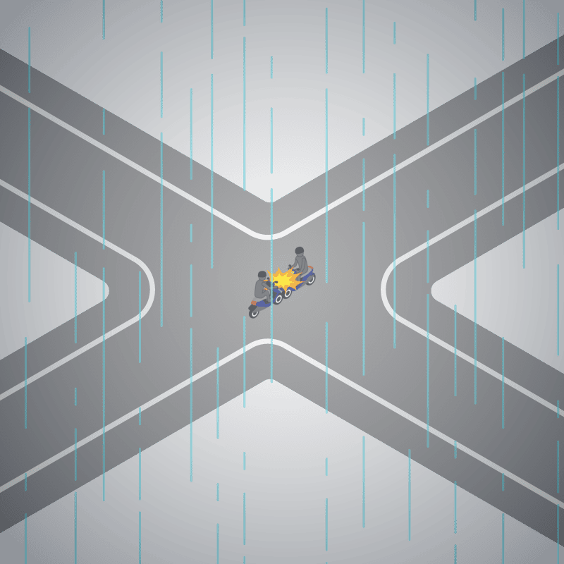 ・イラストに使用している各要素(車、背景、車、天候、信号、衝突地点など)は、代表的なイメージをイラスト化しており、色や形状等含め現実の事故の状況とは異なります。あくまで、事故のイメージとして参考までにご活用ください。