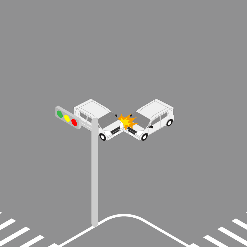 ・イラストに使用している各要素(車、背景、車、天候、信号、衝突地点など)は、代表的なイメージをイラスト化しており、色や形状等含め現実の事故の状況とは異なります。あくまで、事故のイメージとして参考までにご活用ください。