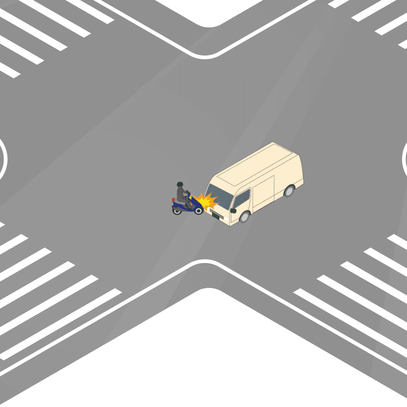 ・イラストに使用している各要素(車、背景、車、天候、信号、衝突地点など)は、代表的なイメージをイラスト化しており、色や形状等含め現実の事故の状況とは異なります。あくまで、事故のイメージとして参考までにご活用ください。