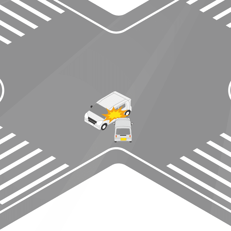 ・イラストに使用している各要素(車、背景、車、天候、信号、衝突地点など)は、代表的なイメージをイラスト化しており、色や形状等含め現実の事故の状況とは異なります。あくまで、事故のイメージとして参考までにご活用ください。