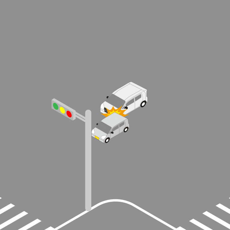 ・イラストに使用している各要素(車、背景、車、天候、信号、衝突地点など)は、代表的なイメージをイラスト化しており、色や形状等含め現実の事故の状況とは異なります。あくまで、事故のイメージとして参考までにご活用ください。