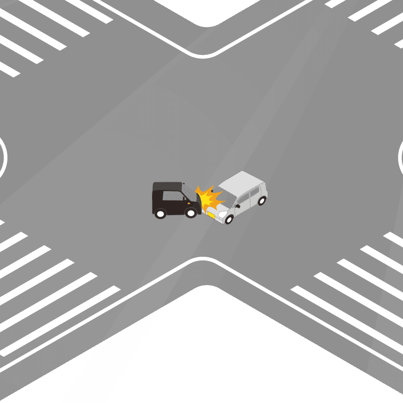 ・イラストに使用している各要素(車、背景、車、天候、信号、衝突地点など)は、代表的なイメージをイラスト化しており、色や形状等含め現実の事故の状況とは異なります。あくまで、事故のイメージとして参考までにご活用ください。