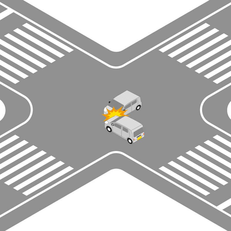 ・イラストに使用している各要素(車、背景、車、天候、信号、衝突地点など)は、代表的なイメージをイラスト化しており、色や形状等含め現実の事故の状況とは異なります。あくまで、事故のイメージとして参考までにご活用ください。
