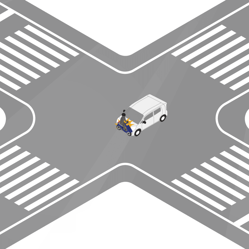 ・イラストに使用している各要素(車、背景、車、天候、信号、衝突地点など)は、代表的なイメージをイラスト化しており、色や形状等含め現実の事故の状況とは異なります。あくまで、事故のイメージとして参考までにご活用ください。