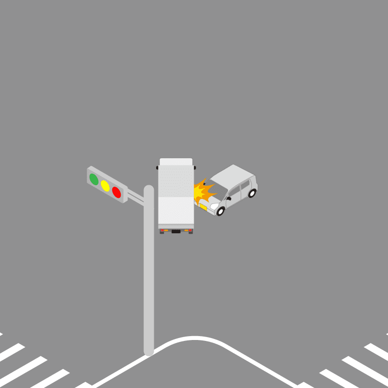 ・イラストに使用している各要素(車、背景、車、天候、信号、衝突地点など)は、代表的なイメージをイラスト化しており、色や形状等含め現実の事故の状況とは異なります。あくまで、事故のイメージとして参考までにご活用ください。