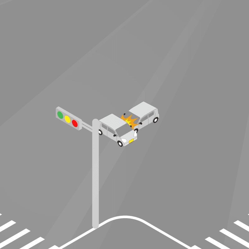 ・イラストに使用している各要素(車、背景、車、天候、信号、衝突地点など)は、代表的なイメージをイラスト化しており、色や形状等含め現実の事故の状況とは異なります。あくまで、事故のイメージとして参考までにご活用ください。