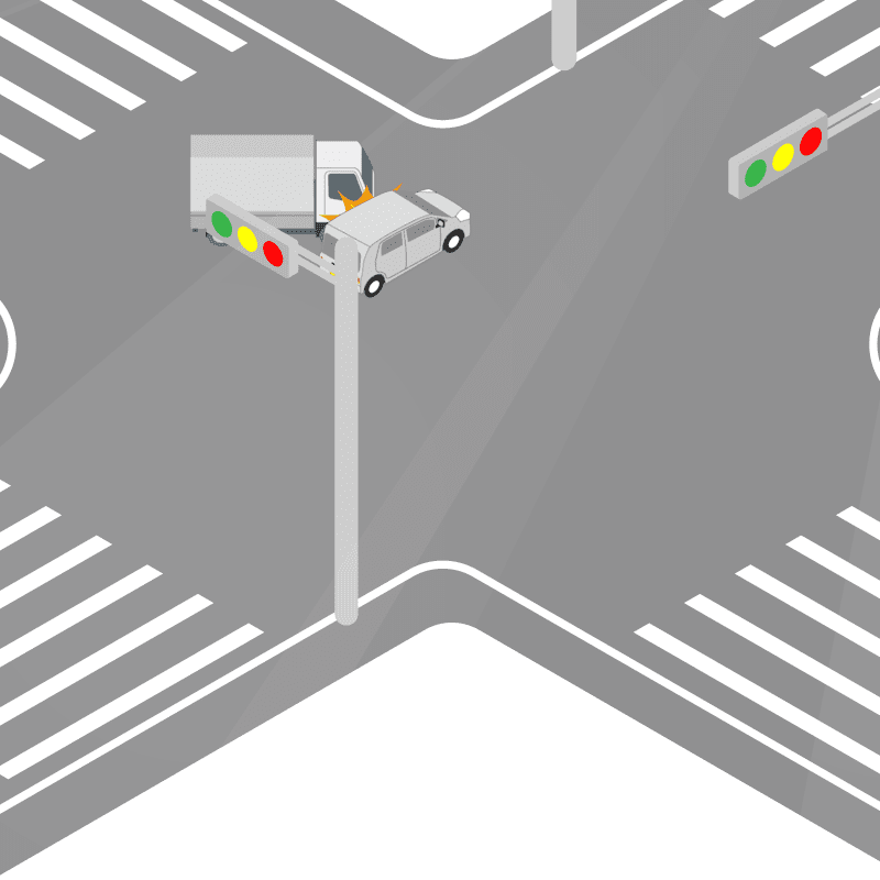 ・イラストに使用している各要素(車、背景、車、天候、信号、衝突地点など)は、代表的なイメージをイラスト化しており、色や形状等含め現実の事故の状況とは異なります。あくまで、事故のイメージとして参考までにご活用ください。