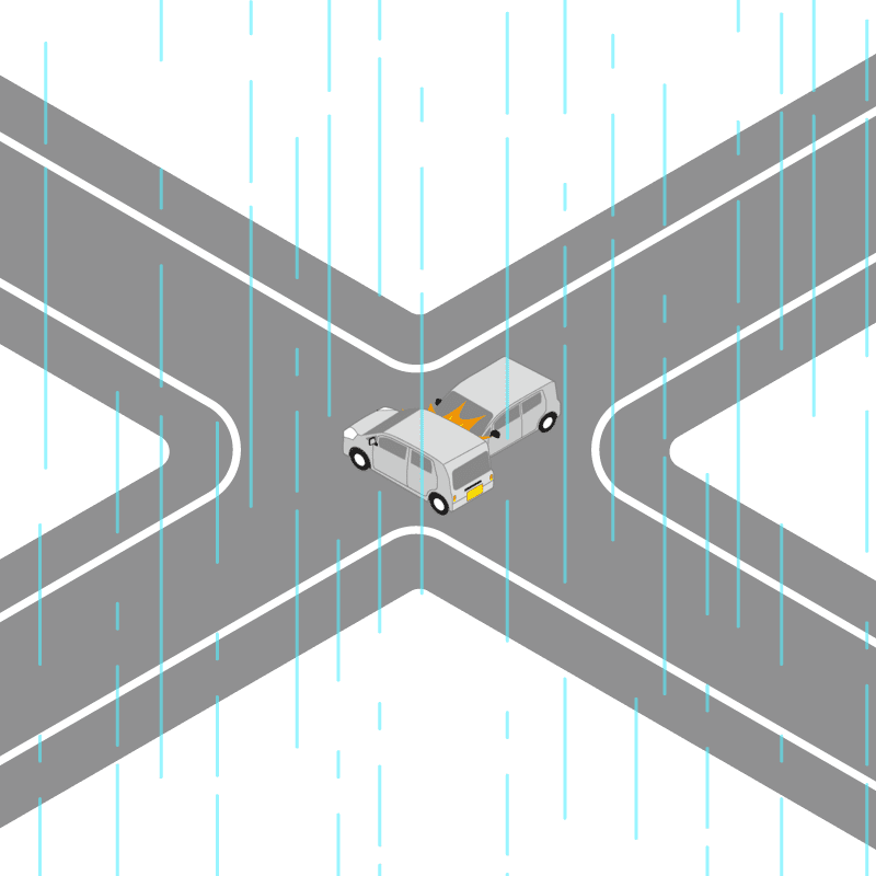 ・イラストに使用している各要素(車、背景、車、天候、信号、衝突地点など)は、代表的なイメージをイラスト化しており、色や形状等含め現実の事故の状況とは異なります。あくまで、事故のイメージとして参考までにご活用ください。