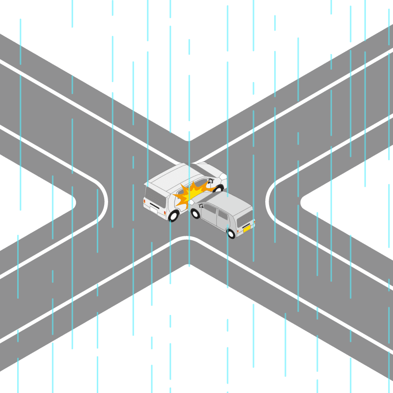 ・イラストに使用している各要素(車、背景、車、天候、信号、衝突地点など)は、代表的なイメージをイラスト化しており、色や形状等含め現実の事故の状況とは異なります。あくまで、事故のイメージとして参考までにご活用ください。