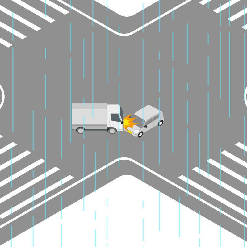 ・イラストに使用している各要素(車、背景、車、天候、信号、衝突地点など)は、代表的なイメージをイラスト化しており、色や形状等含め現実の事故の状況とは異なります。あくまで、事故のイメージとして参考までにご活用ください。