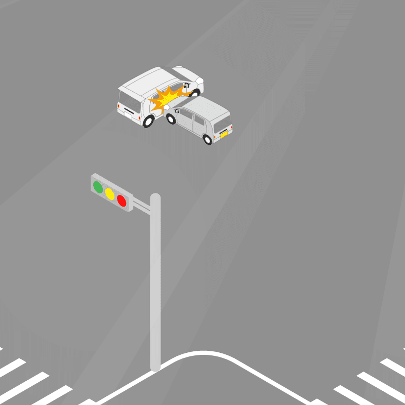 ・イラストに使用している各要素(車、背景、車、天候、信号、衝突地点など)は、代表的なイメージをイラスト化しており、色や形状等含め現実の事故の状況とは異なります。あくまで、事故のイメージとして参考までにご活用ください。