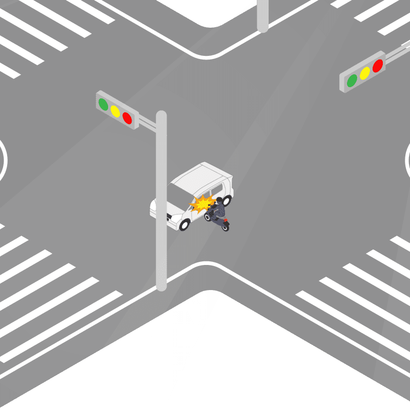 ・イラストに使用している各要素(車、背景、車、天候、信号、衝突地点など)は、代表的なイメージをイラスト化しており、色や形状等含め現実の事故の状況とは異なります。あくまで、事故のイメージとして参考までにご活用ください。