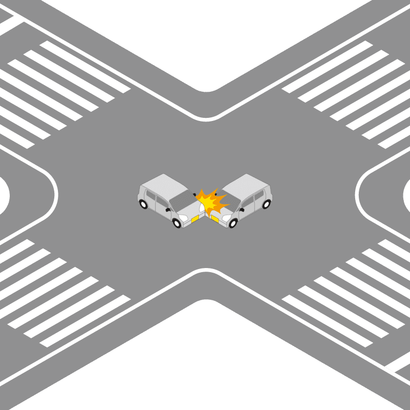 ・イラストに使用している各要素(車、背景、車、天候、信号、衝突地点など)は、代表的なイメージをイラスト化しており、色や形状等含め現実の事故の状況とは異なります。あくまで、事故のイメージとして参考までにご活用ください。