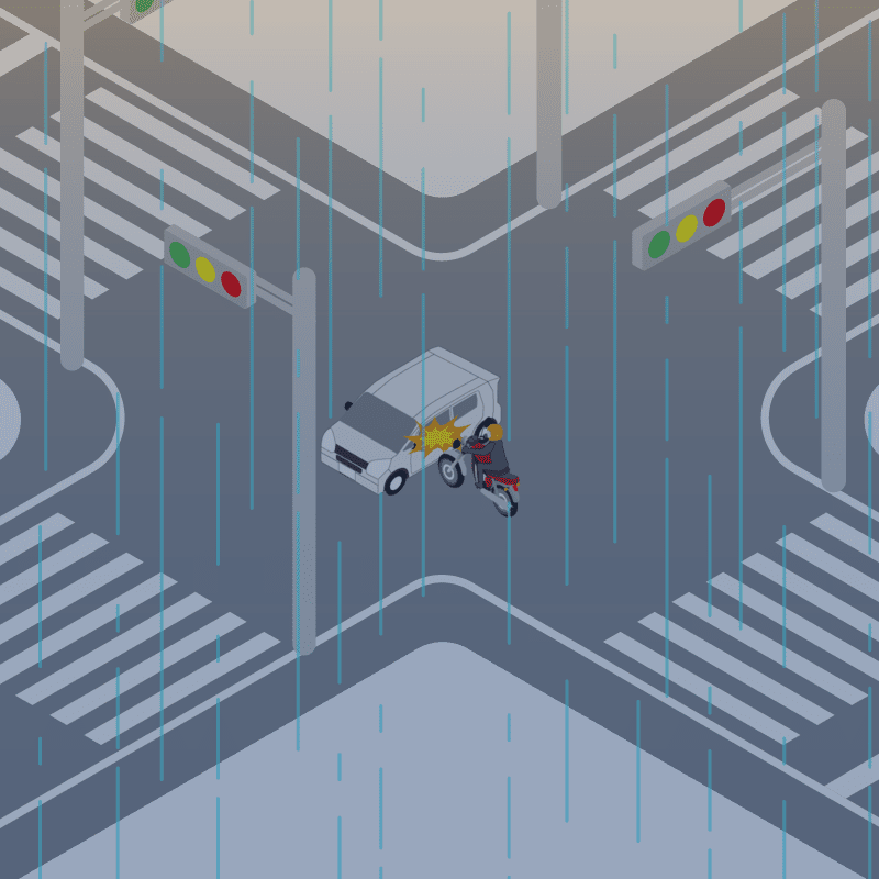 ・イラストに使用している各要素(車、背景、車、天候、信号、衝突地点など)は、代表的なイメージをイラスト化しており、色や形状等含め現実の事故の状況とは異なります。あくまで、事故のイメージとして参考までにご活用ください。